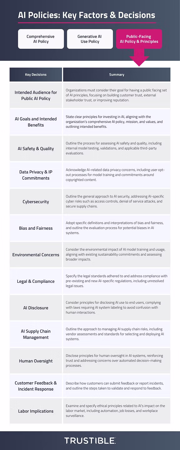 Many organizations are seeking to build more trust by making their tAI principles and policies publicly available. We call this an organization’s public AI policy, and it’s often meant to provide transparency into the AI governance operations of the organization. While some may see these public policies as a way to manage an organization’s reputation, there can be serious legal and regulatory ramifications if a company does not adhere to its own public AI policy.