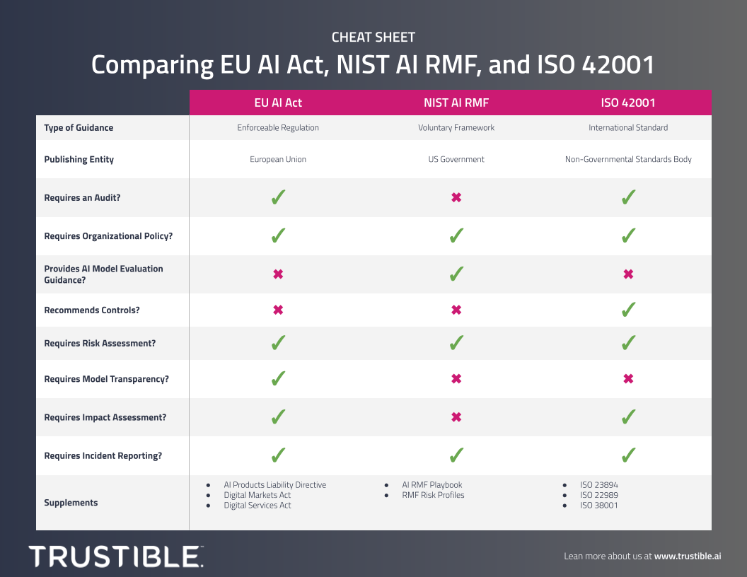 Navigating the evolving and complex landscape for AI governance requirements can be a real challenge for organizations. We’ve created this comprehensive cheat sheet comparing three important compliance frameworks: the EU AI Act, the NIST AI Risk Management Framework, and ISO 42001. This easy to understand visual maps the similarities and differences between these frameworks, providing a concise reference for organizations implementing responsible AI guardrails.