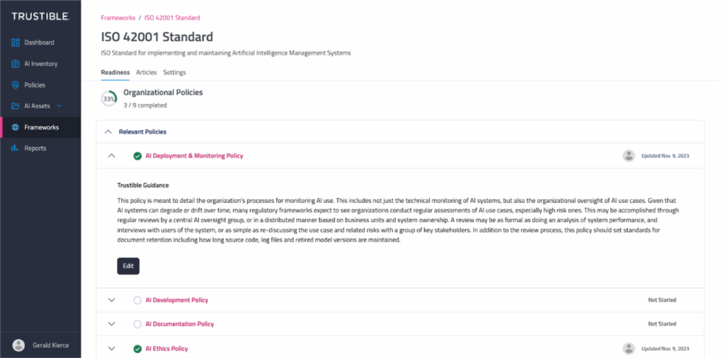Trustible’s integration of ISO 42001 caters to organizations of all sizes, providing them with a scalable and detailed roadmap towards compliance with this emerging AI safety standard. While ISO 42001 remains voluntary, its adoption through Trustible’s platform enables customers to demonstrate trust to stakeholders and get ahead of the emerging regulatory environment.